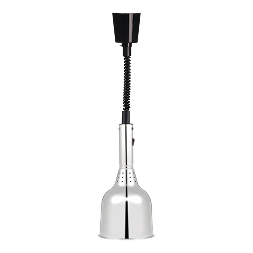 chroom, met hoogte instelbaar snoer tot max. 180cm, voorzien van handgrepen en schakelaar, geeft onmiddellijk directe hitte, verschaft een doordringende warmte zonder dat het oppervlakte van saus of jus stolt, makkelijk te installeren, veilig in gebruik, wordt zonder lamp geleverd.