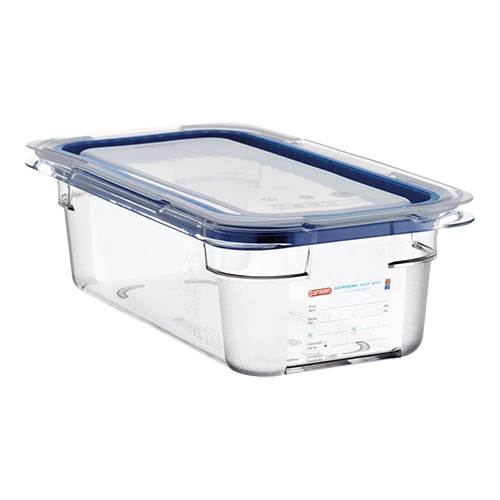 gastronorm bewaarbak, Araven, polycarbonaat, geschikt voor temperaturen van -40°C tot +99°C, voorzien van een permanent label welke herschrijfbaar is, de GN bakken zijn stapelbaar en kunnen omgekeerd ook als deksel dienen, inclusief deksel voorzien van een siliconen afdichtrand.