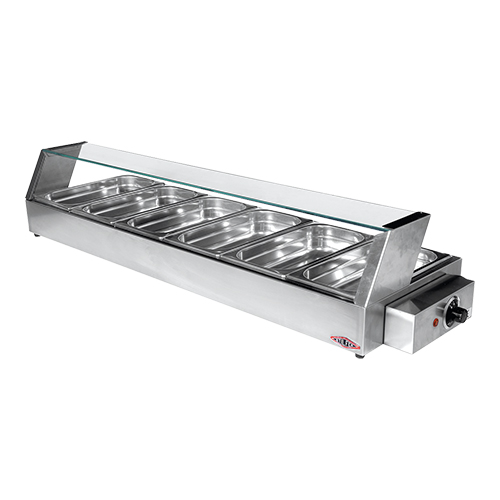 GN maatvoering, uitgevoerd in roestvrijstaal 18/10, met veiligheidsglas, met thermostaat en controle lampje, geschikt voor GN bakken van max. 65mm diep, wordt zonder GN bakken geleverd. Afmetingen: (h)22x110x34 cm. 220 volt 1600 watt