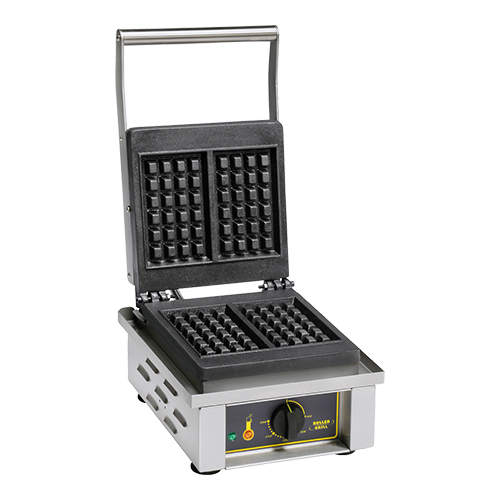 Roller grill wafel apparaat, type Luikse wafels, ommanteling roestvrijstaal 18/10, platen vervaardigd uit gietijzer, compleet met traploze instelbare thermostaat 0-300°C, controlelampje, lekbak en verlichte hoofdschakelaar. Afmetingen: (h)23x31x40 cm 230 volt 1600 watt