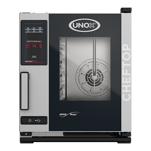 Unox ChefTop Mindmaps One Compact, Combisteamer, power version, de oven heeft een Master Touch bedieningsscherm, hiermee kunnen gerechten handmatig bereid worden, maar het geeft ook toegang tot een lijst met bereidingscycli die eerder zijn opgeslagen of kunnen er nieuwe recepten gemaakt worden, die vervolgens opgeslagen kunnen worden, afstand tussen de roosters is 67cm, DRY.Maxi voor de ideale luchtvochtigheid, Steam.Maxi voor perfect stomen, Air.Maxi voor een perfecte heteluchtcirculatie, automatische reinigingssysteem Rotor.Klean, Auto.Pure-antikalkfilter, wordt geleverd zonder roosters of bakplaten, capaciteit 5x (2/3GN). Afmetingen (h)65x54x66 cm (krachtstroom) 400 volt 5200 watt