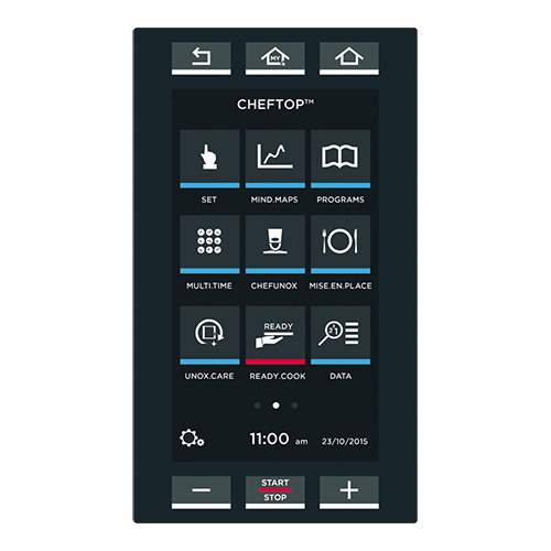 Unox ChefTop Mindmaps PLUS, Combisteamer, de oven heeft een Master Touch bedieningsscherm, hiermee kunnen gerechten handmatig bereid worden, maar het geeft ook toegang tot een lijst met bereidingscycli die eerder zijn opgeslagen of kunnen er nieuwe recepten gemaakt worden, die vervolgens opgeslagen kunnen worden, afstand tussen de roosters is 67cm, de oven heeft Adaptive.Cooking, Multi.Time dat stelt u in staat 10 verschillende producten tegelijk te bakken, Mise.en.Place waardoor alle gerechten op dezelfde tijd klaar zijn, Dry.Maxi voor de ideale luchtvochtigheid, Steam.Maxi voor perfect stomen, Air.Maxi voor een perfecte hetelucht circulatie, automatische reinigingssysteem Rotor.Klean en het Auto.Pure-antikalkfilter, wordt geleverd zonder roosters of bakplaten, capaciteit 5x (1/1GN). Afmetingen (h)68x75x78 cm (krachtstroom) 400 volt 9300 watt.