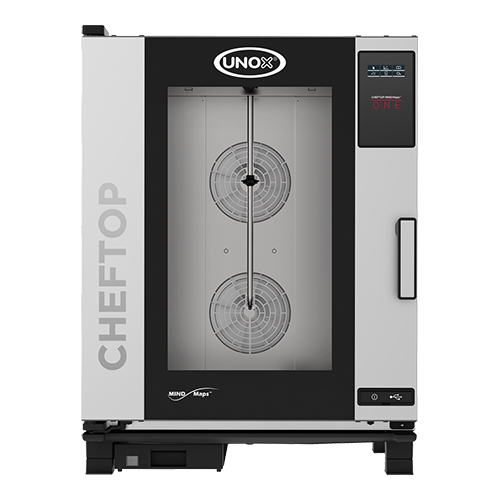 Unox ChefTop Mindmaps One, Combisteamer, de oven heeft een Master Touch bedieningsscherm, hiermee kunnen gerechten handmatig bereid worden, maar het geeft ook toegang tot een lijst met bereidingscycli die eerder zijn opgeslagen of kunnen er nieuwe recepten gemaakt worden, die vervolgens opgeslagen kunnen worden, afstand tussen de roosters is 67cm, DRY.Maxi voor de ideale luchtvochtigheid, Steam.Maxi voor perfect stomen, Air.Maxi voor een perfecte heteluchtcirculatie, automatische reinigingssysteem Rotor.Klean, Auto.Pure-antikalkfilter, wordt geleverd zonder roosters of bakplaten, capaciteit 10x (1/1GN). Afmetingen (h)101x75x78 cm (krachtstroom) 400 volt 14000 watt.