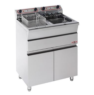 Friteuse staand model Stilfer, dubbel, elektrisch, zijn geheel uit roestvrijstaal vervaardigd, uitgevoerd met een thermostaat, maximaal-beveiliging, hoofdschakelaar, controle lampjes, koude zone en aftapkraan, voorzien van een vetopvangbak. . Afmetingen (h)87x72x58 cm (krachtstroom)2 x 400 volt 2 x 7000 watt.