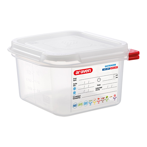 Gastronorm voedseldozen, Araven,luchtdicht afsluitbaar door uniek dubbel afsluitsysteem, geschikt voor vriezer -40°C en magnetron +90°C ( plaatsen zonder deksel ), vaatwasmachine bestendig, wordt compleet geleverd met Colorclip product coderingsset volgens de HACCP normen (rood, geel, groen en blauw). De dozen worden geleverd inclusief deksel.