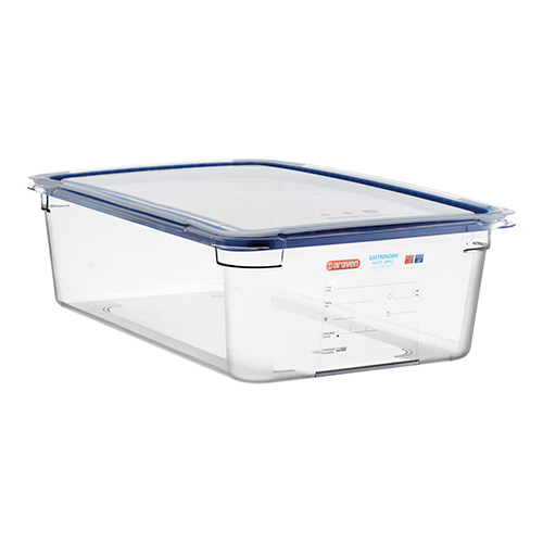 gastronorm bewaarbak, Araven, polycarbonaat, geschikt voor temperaturen van -40°C tot +99°C, voorzien van een permanent label welke herschrijfbaar is, de GN bakken zijn stapelbaar en kunnen omgekeerd ook als deksel dienen, inclusief deksel voorzien van een siliconen afdichtrand.