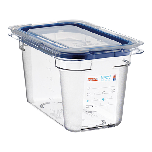 gastronorm bewaarbak, Araven, polycarbonaat, geschikt voor temperaturen van -40°C tot +99°C, voorzien van een permanent label welke herschrijfbaar is, de GN bakken zijn stapelbaar en kunnen omgekeerd ook als deksel dienen, inclusief deksel voorzien van een siliconen afdichtrand.