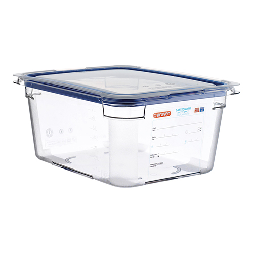 gastronorm bewaarbak, Araven, polycarbonaat, geschikt voor temperaturen van -40°C tot +99°C, voorzien van een permanent label welke herschrijfbaar is, de GN bakken zijn stapelbaar en kunnen omgekeerd ook als deksel dienen, inclusief deksel voorzien van een siliconen afdichtrand.