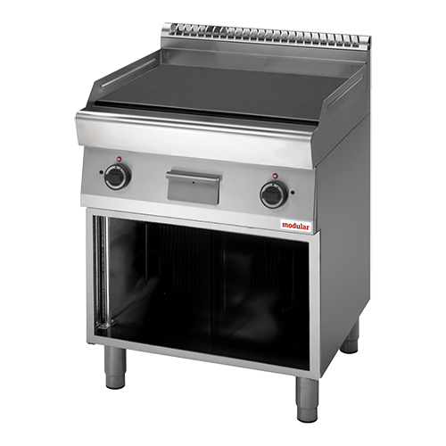elektrisch, bakplaat van glad geslepen gietstaal met maximaal benutbaar bakoppervlak, zeer snelle verhittingstijd, traploze thermostaat met ingebouwde aan/uit schakelaar, voorzien van een grote ingebouwde vetopvanglade, de 70cm modules 2 onafhankelijk instelbare verhittingszones