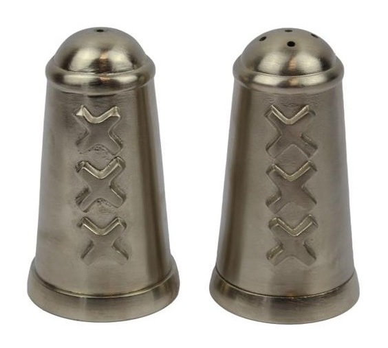 De peper- en zoutstellen met de drie Andreaskruisen van Amsterdam zijn verkrijgbaar in zilver en goud. Een must-have voor de (Amsterdamse) horeca!