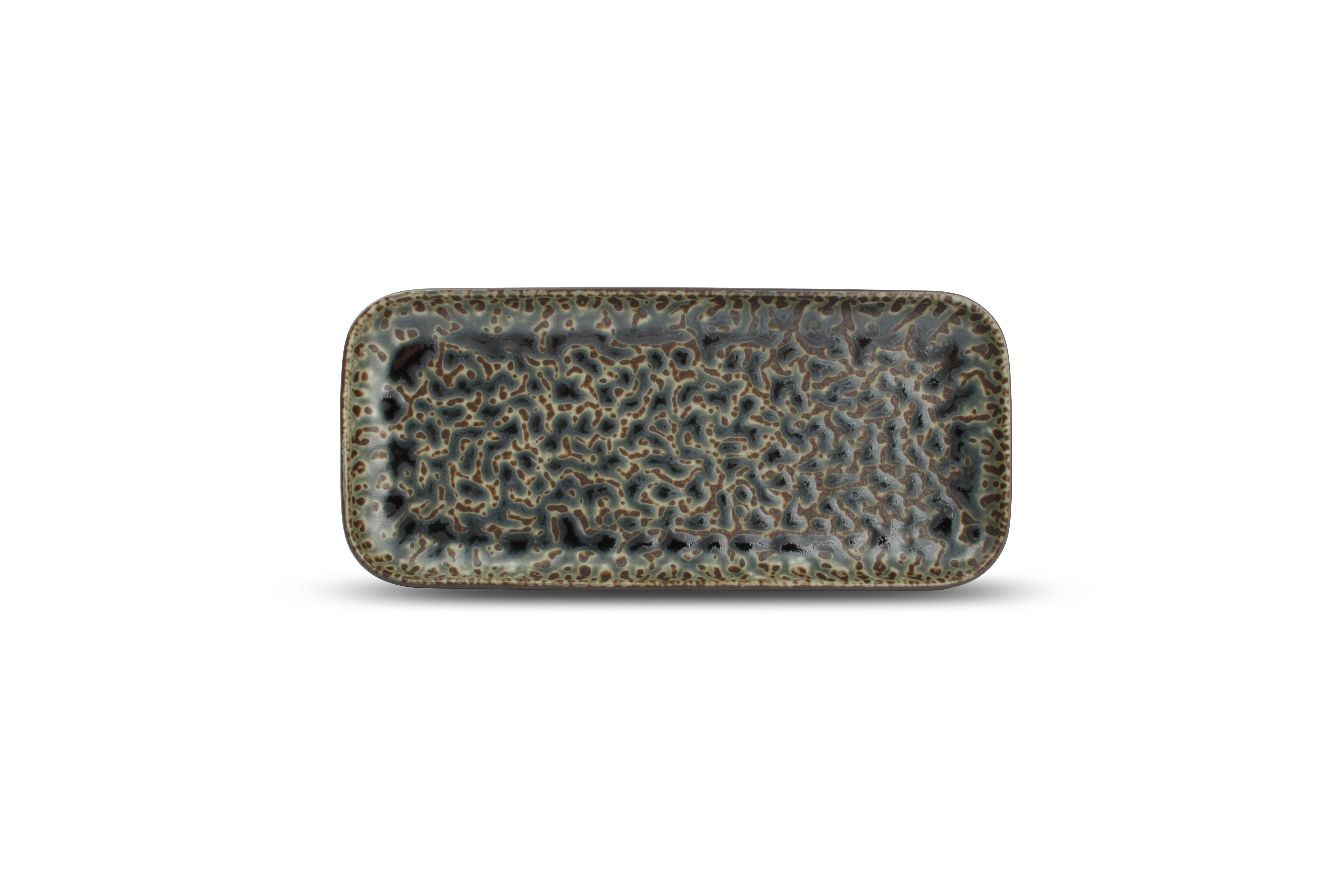 Deep emerald green veins and rusty brown tones flow together in this strong emerald Oxido tableware. With its unique whimsical surface and roughed look, this porcelain range invites you to create adventurous compositions. All items are unique due to the handmade finish with reactive glazes.