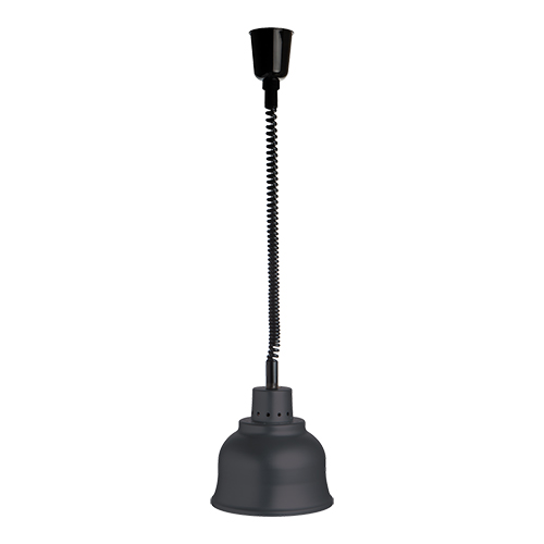 zwart, met hoogte instelbaar snoer max. 180cm, voorzien van schakelaar, geeft onmiddellijk directe hitte, verschaft een doordringende warmte zonder dat het oppervlakte van saus of jus stolt, makkelijk te installeren, wordt met infrarood lamp geleverd (250W). diamter kap 23 cm