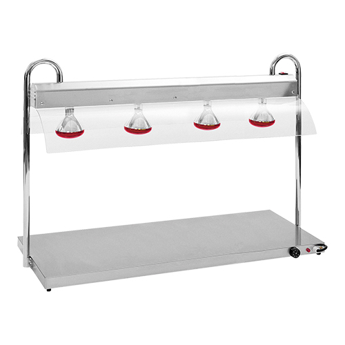roestvrijstaal 18/10 en verchroomde staanders, met apart inschakelbare verwarmde roestvrijstalen warmhoudplaat, thermostatisch instelbaar tot 90°C, compleet met hygiënische beschermkap van acrylglas en infra-roodlampen. Afmetingen: (h)83x136x53 cm. 220 volt, 2500 watt.