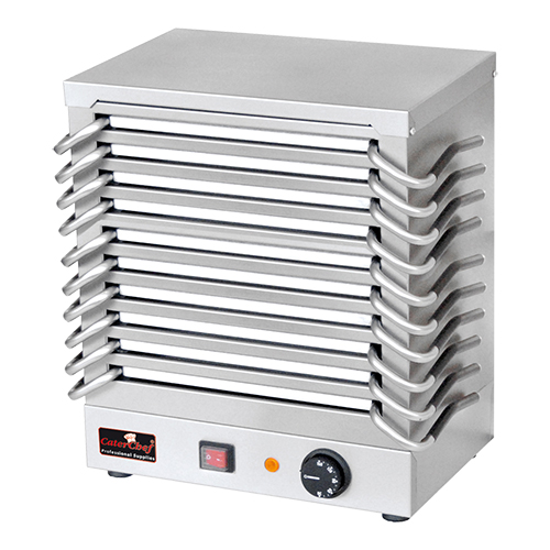 roestvrijstalen uitvoering, 10 platen, temperatuur variabel instelbaar d.m.v. traploze thermostaat, lichtgewicht warmhoudplaten van speciaal aluminium met hoog hitte opnamevermogen en snelle opwarmtijd, met verlichte aan/uit schakelaar. Afmetingen: (h)44x37x24,5 cm. 220 volt, 1200 watt