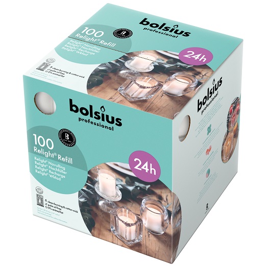 Refill kaarsen / ReLight transparant, Bolsius, branduren 24 uurs, doos 100 stuks