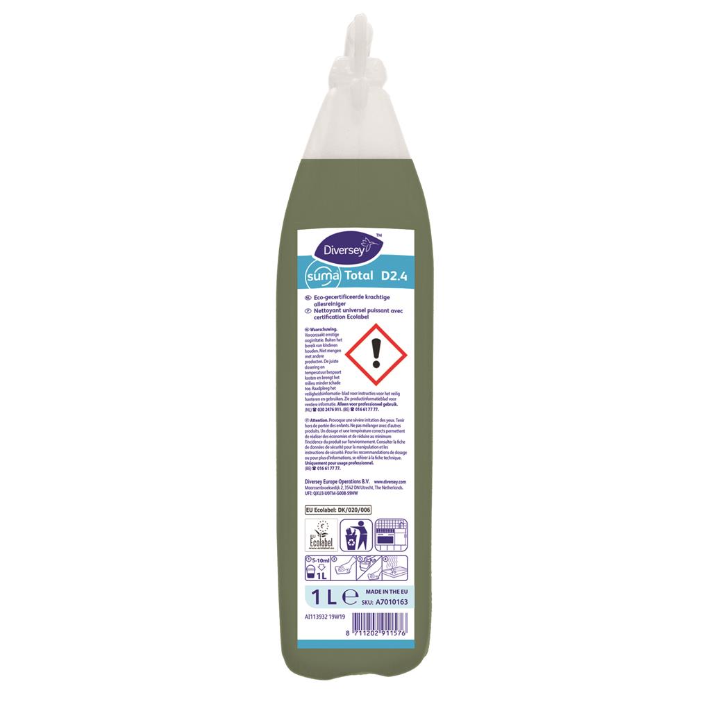 Suma Total D2.4 is een pH neutraal, geconcentreerd vloeibaar reinigingsmiddel dat geschikt is voor het reinigen van alle watervaste oppervlakken in de keuken. Dit product is sterk ontvettend, perfect bevochtigend en geschikt voor zowel handmatig als machinaal gebruik. Bovendien is het toepasbaar bij alle waterhardheden.