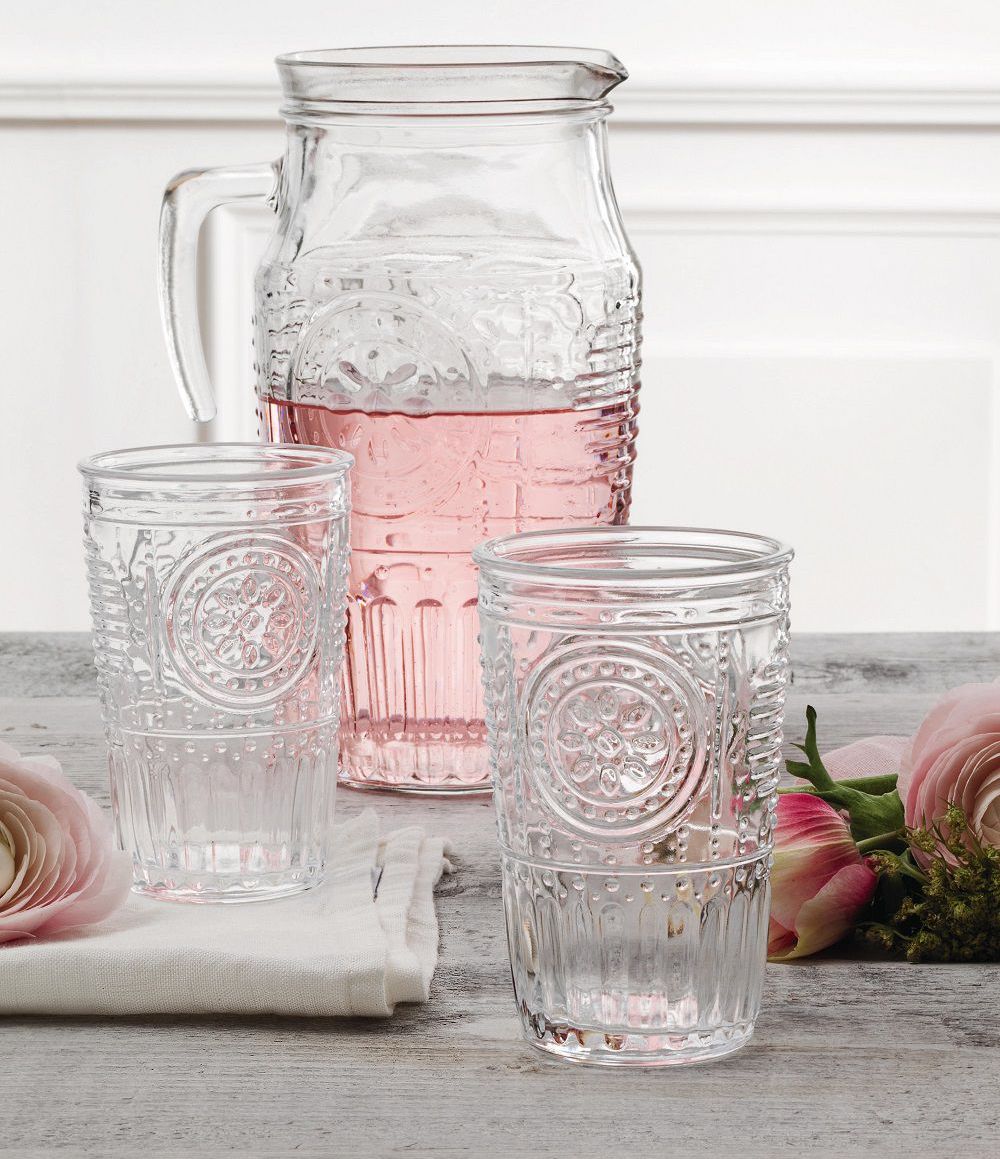 Een set van zes Bormioli Rocco Romantic glazen. De glazen hebben vrolijke en speelse reliëftekeningen aan de buitenkant. Die maken de glazen niet alleen mooier, maar zorgen ook voor meer grip bij het vasthouden