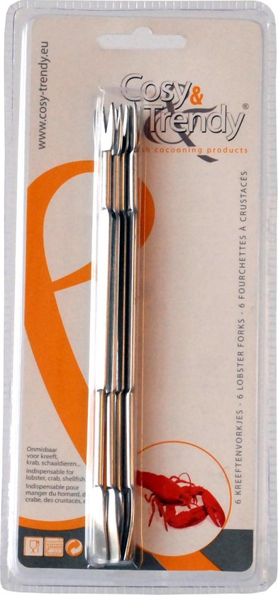 Zes smalle, lange kreeftenvorkjes in roestvrij staal om alle stukjes vlees uit de scharen en de poten van de kreeft te halen. De fijne vorkjes zijn speciaal gevormd om in de kleinste hoeken te komen, wat met een normaal bestek onmogelijk is. Voor kreeftliefhebbers is dit onmisbaar om puur van kreeft te kunnen genieten.