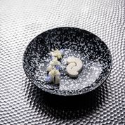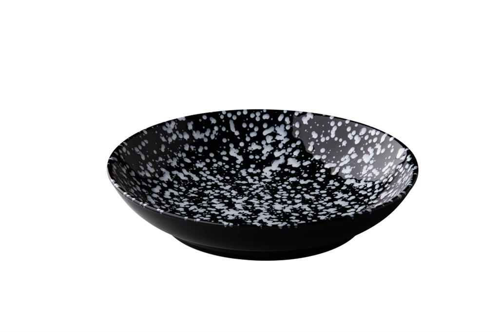 Q Authentic zwart pasta bord met witte spots.