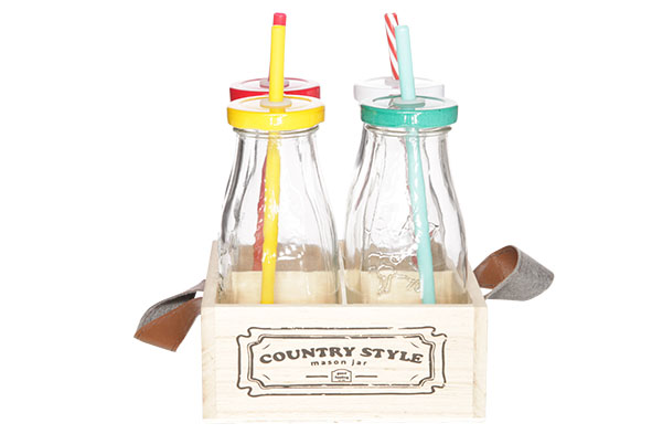 Fles met rietje country style, 30 cl met houten kistje, 1 set.