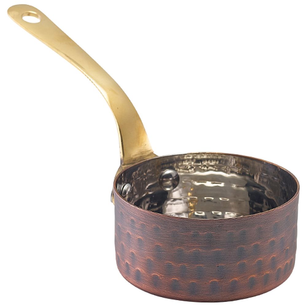 Great for presenting small dishes, sauces or sides, the Antique Copper Sauce Pans feature an attractive brass handle providing an upscale look to casual dining. Made from Stainless Steel with a striking antique copper plated finish, they work great with Terra Porcelain, Stoneware or Wooden Serving Boards. The Mini Antique Copper Pans are available in three sizes suitable for a variety of uses from small steak sauces to premium sides.
