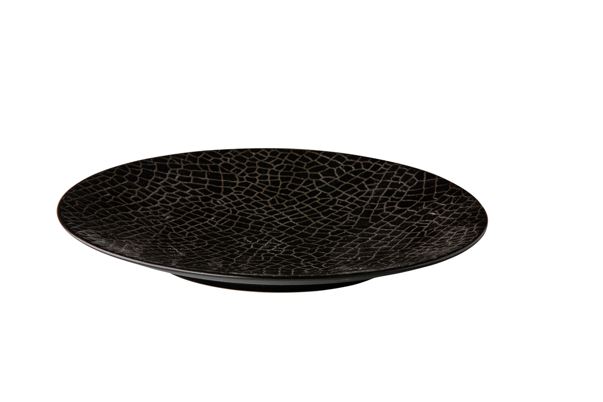 Het relief lijkt ingezet met zwarte steentjes, gevormd tot een MOZAIEK en is zeker een toevoeging voor uw gedekte tafel en een verrrassing voor uw gasten.