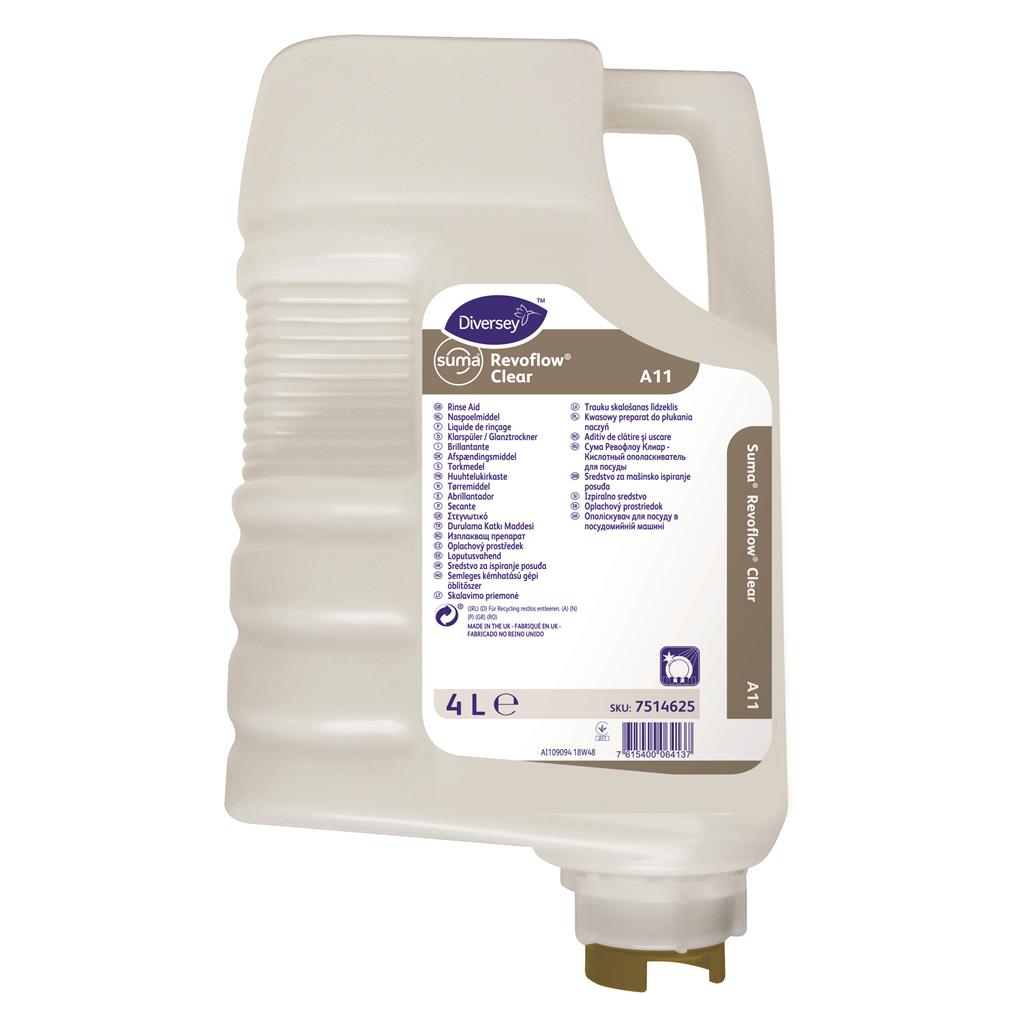 Suma Revoflow Clear A11 is een geconcentreerd schuimremmend naspoelmiddel voor machinale vaatwas met kalkwerende werking.