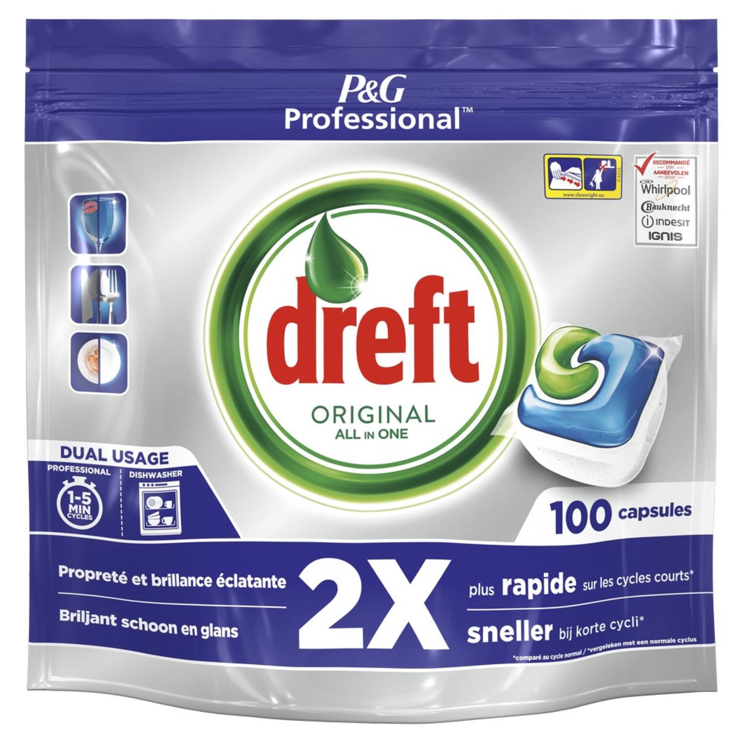 Dreft Professional All In One Vaatwastabletten zijn afwasmiddelcapsules met alkaline die speciaal zijn ontwikkeld voor het dagelijks reinigen van uw vaat in een professionele vaatwasser. Het biedt de reiniging die u van Dreft gewend bent, lost snel op en reinigt hardnekkige voedselresten op uw vaat. Daarnaast biedt het zilverbescherming, metaalglans voor stralend bestek en roestvrijstalen voorwerpen, en bevat het spoelmiddel en zout (de zoutwerking is effectief bij zacht, gemiddeld en hard water tot 26 dH. Uw vaatwasser werkt effectief zelfs wanneer het waarschuwingslampje voor spoelmiddel of zout is ingeschakeld).