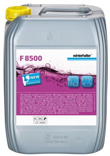 Winterhalter F 8500, hygiëne universeel reiniger, vloeibaar, hoogalkalisch, actief-chloorhoudend reinigingsmiddel, fosfaatvrij, can 12 kg.