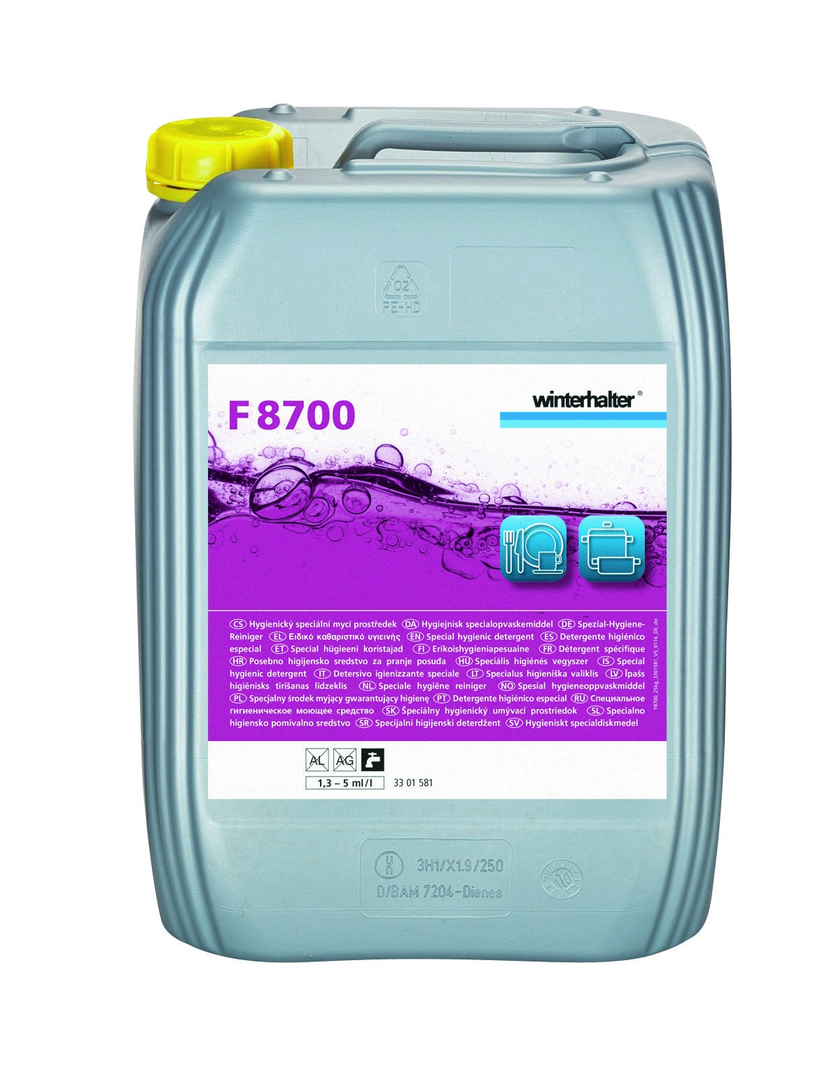 Winterhalter F 8700, speciale hygiëne reiniger, Vloeibaar, hoogalkalisch, actief-chloorhoudend universeel reinigingsmiddel, speciale voor hard water, can 12 kg.